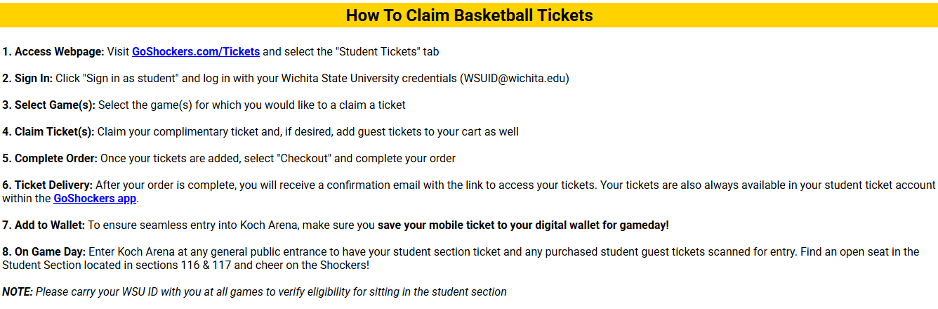 Students at Wichita State can now claim men’s basketball tickets online as part of WSU Athletics’ new game day enhancements at Koch Arena.